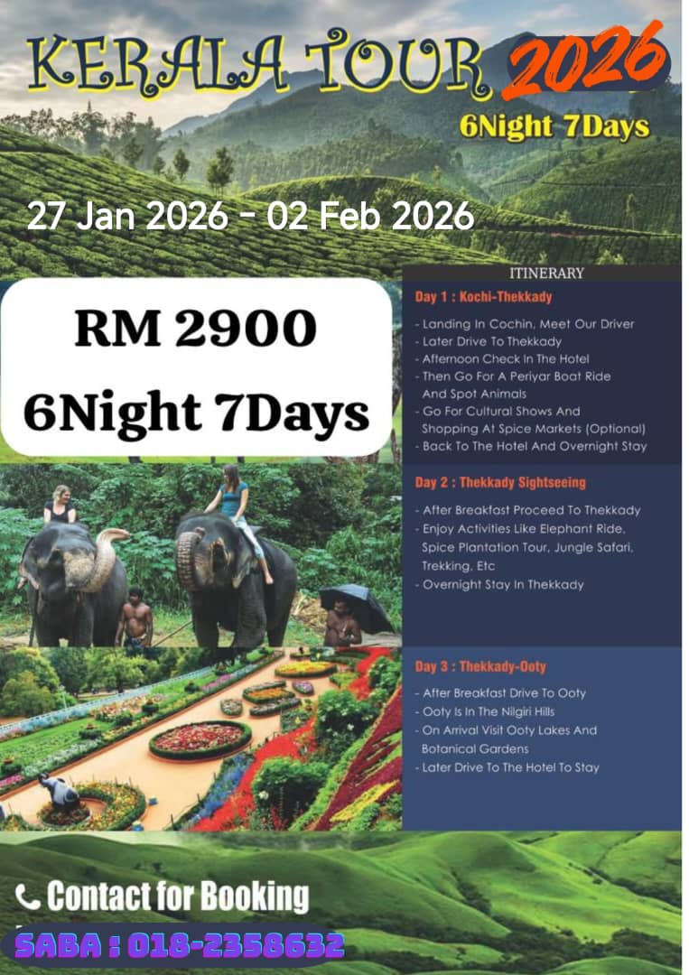 Escape into the lush greenery of Kerala with our exclusive Kerala Tour 2026, happening from 27 January 2026 to 02 February 2026. This 7-day, 6-night journey takes you through the breathtaking landscapes of Kochi, Thekkady, and Ooty, offering a perfect mix of nature, culture, and adventure. Priced at RM 2900, this package is ideal for travelers seeking a peaceful and refreshing getaway.